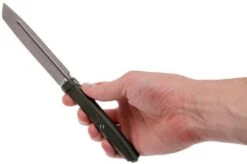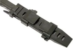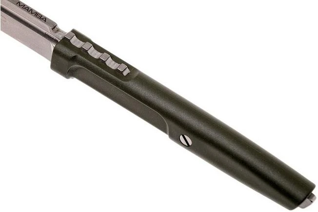 The Extrema Ratio Mamba is a smart fixed knife with a distinctive tanto shape. The Mamba is named after the famous Mamba snakes, mainly found in Africa. Just like its namesake, the Mamba is sleek and slender. And dangerous, too. The blade is made from stainless Böhler N690 steel. This steel retains its sharpness well and is also easy to sharpen. The blade is a tanto, a pointed shape that is especially effective at piercing. There is a groove in each side to save even more weight and thus improve the overall balance. The handle is made from durable Forprene plastic. It’s comfortable in hand, even after a long period of use. The blade has a sturdy tang that can be seen at the end of the handle.