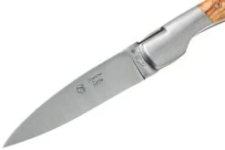 Classic French hand-made Laguiole pocket knife. Closed length: 12.3 cm. Features a 12c27 steel blade and back-lock system. Handle is made from olive wood.
