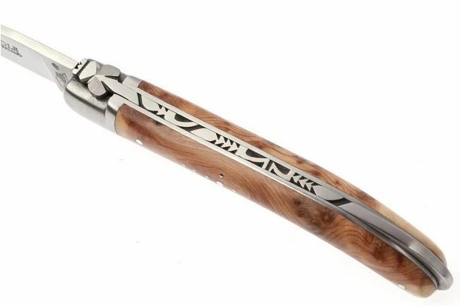 Classic French handmade Laguiole pocket knife. Length closed: 9 cm Enhanced with a blade made from satinized 14C28N steel, enhanced with a lock. Handle with juniper wood.