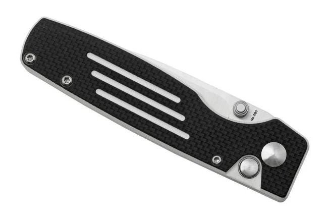 This Kizer Original Tuxedo is a chic pocket knife designed by the people at Kizer themselves. You open the droppoint blade with the thumb studs. A button lock ensures the blade remains in place, whether open or closed. To close the knife, simply press the button and the blade will smoothly return to the handle. This combination guarantees hours of fidgeting fun,