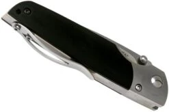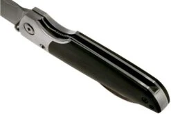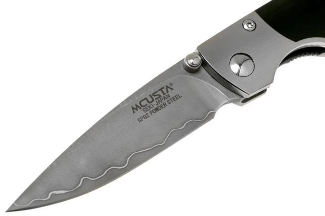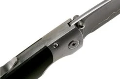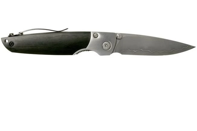 The Mcusta MC-144G Shinra Mixture Teana black pakka wood is a stylish Japanese gentleman’s knife. The handle is made from stunning black pakka wood. Complemented by beautiful stainless steel bolsters. The transition from wood to steel bolsters was carried out perfectly. You hardly feel an edge when you move your finger over it. The spine of the blade is nicely rounded and the blade moves smoothly. When opened the blade is locked by a linerlock. The pocket clip of this knife is attached to the spine of the handle