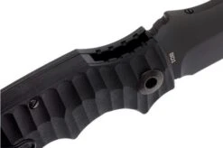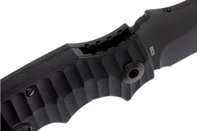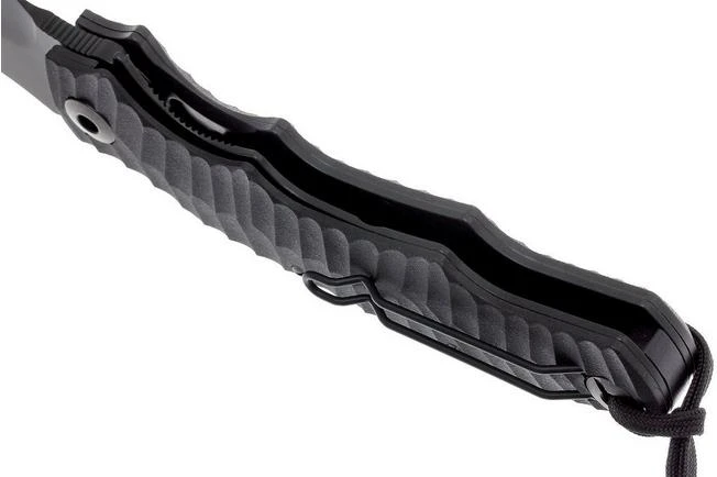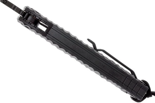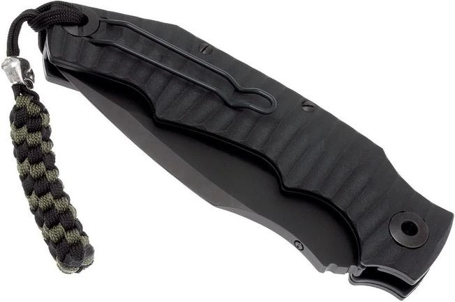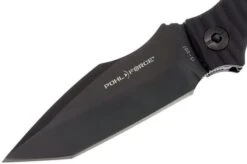 The Pohl Force Alpha Five Survival is a large and robust folding knife, designed by Dietmar Pohl. The knife has a beautiful hollow pivot (hinge screw). It can even be adjusted with a small coin. The shape of the hollow pivot comes back in the design of the lanyard-hole at the back of the handle. It also keeps the pocket clip in place, which can be carried tip-up on both sides. The solid zytel handle has a wide-grip texture. Due to its size there is enough room to properly hold this knife, even with gloves.