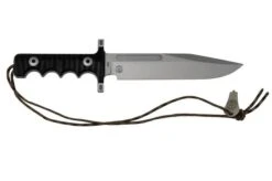 The Pohl Force Quebec Two is a large fixed knife, and the second version of this design. Its shape and finger guards are reminiscent of a fighter’s knife, a bayonet even. The large finger grooves offer a great grip. The difference with the Quebec One is the groove on the blade. This gives the knife an even tougher look and improves its sturdiness.